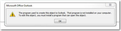 When you open an attachment in an email, contact, or task formatted as Rich Text you get the following error:outlook-2010-2007-this-program-used-to-create-is-outlook-not-installed