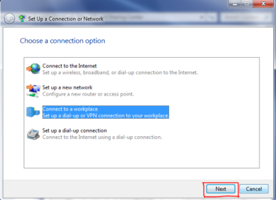 In the appeared window select “Connect to a workplace“, click “Next“.